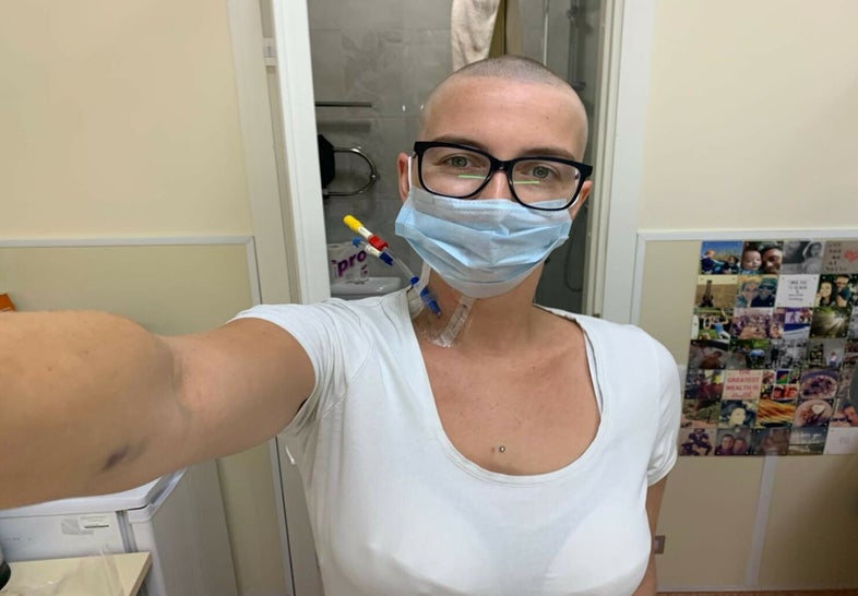 "are you ready for first day chemo?"... "do I have a choice..?" denk dat ze zo'n grapje niet zo waarderen hier, komt geen lachje van af.
