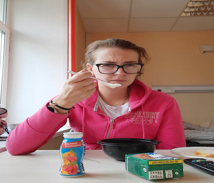 Gisteren kwamen we aan na diner tijd. Dus Anastasia ging op zoek naar eten.. En dat vond ze. Een maaltijd, appel, sinasappel, thee en yoghurt drinks.